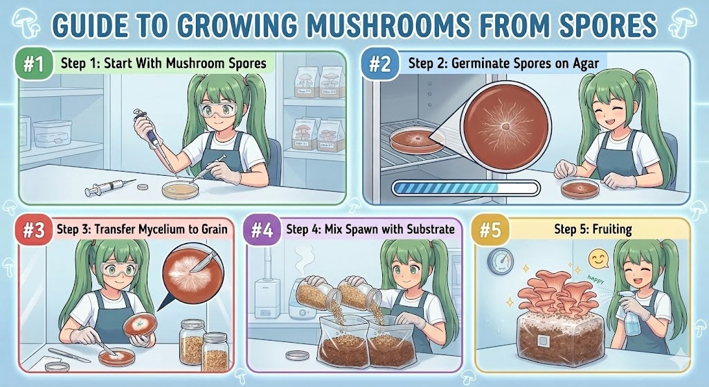Growing mushrooms from spores takes a few more steps than using spawn, but it’s how many growers start new mushroom cultures. Here’s the basic process. 🍄 Step 1: Start With Mushroom